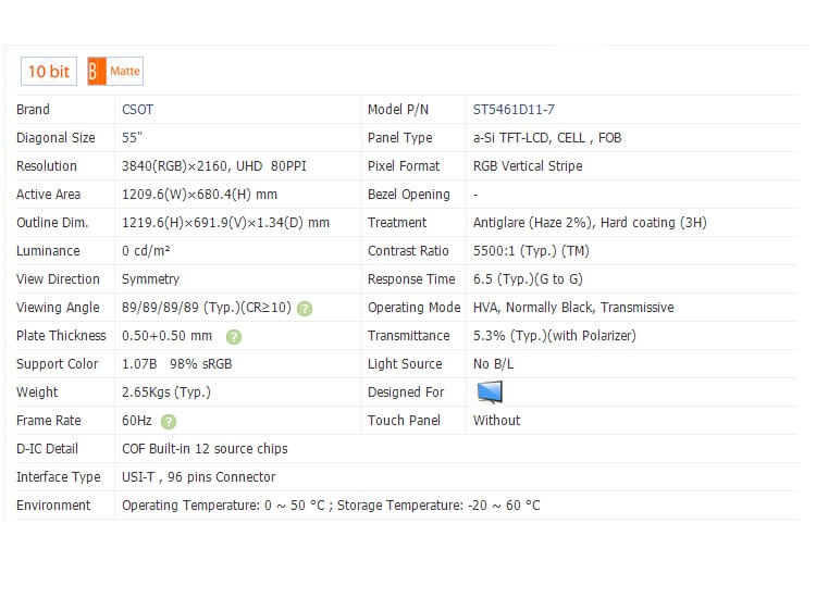 | Pixel Format | 3840(RGB)*2160 (UHD) 80PPI | D-IC Detail | COF Built-in 12 source chips |