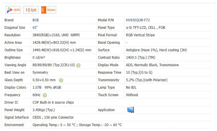 | Model name | HV650QUB-F72 | Display Size | 65 inches |
