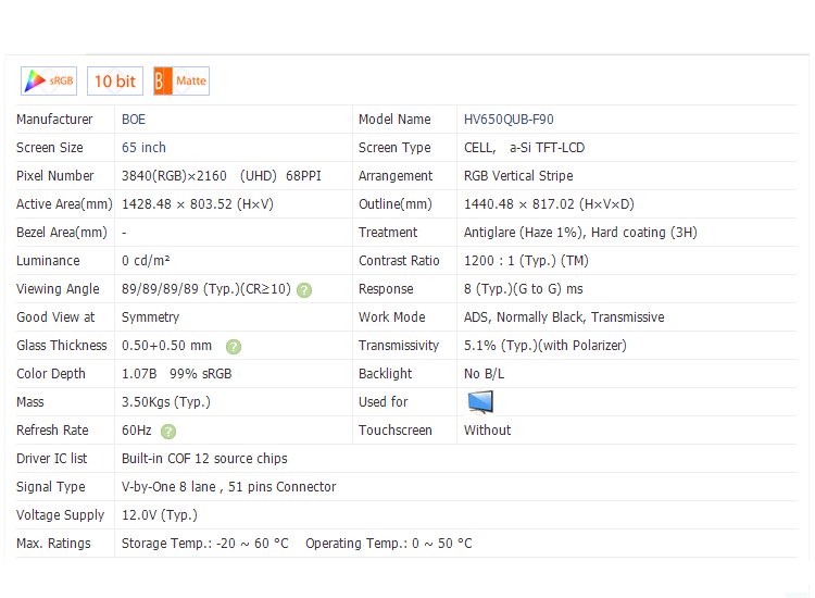 | Model name | HV650QUB-F90 | Display Size | 65 inches |