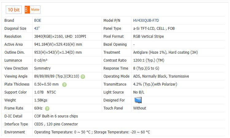 | Model name | HV430QUB-F7D | Display Size | 43 inches |