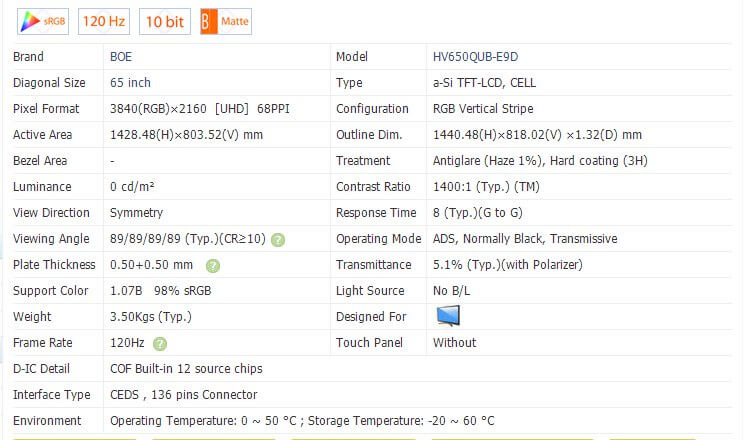 | Model name | HV650QUB-E9D | Display Size | 65 inches |