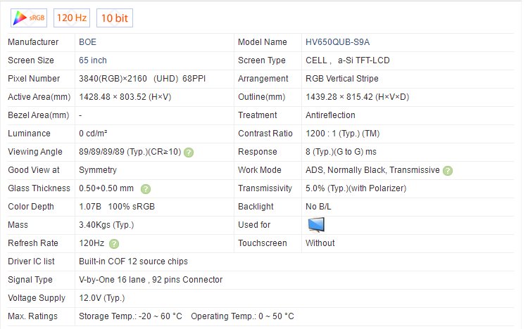 | Model name | HV650QUB-S9A | Display Size | 65 inches |