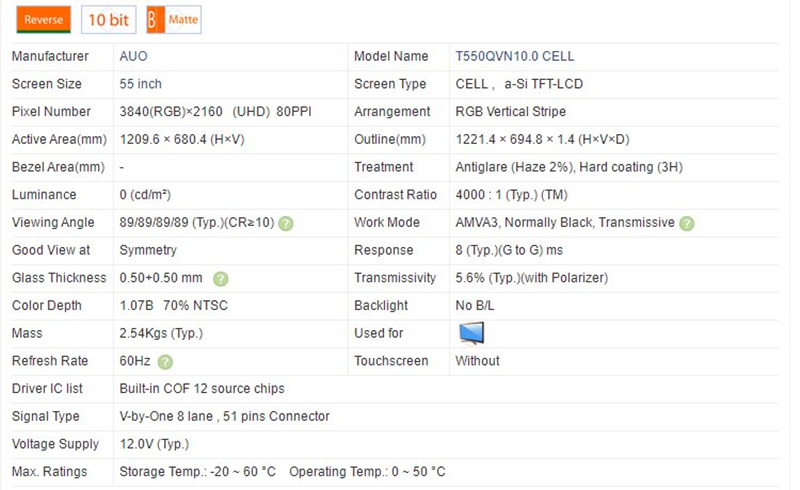 | Model name | T550QVN10.0 | Display Size | 55 inches |