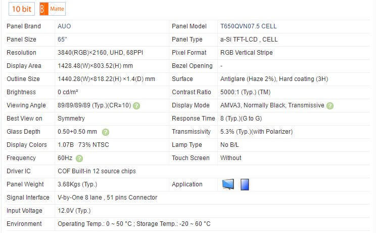 | Model name | T650QVN07.5 | Display Size | 65 inches |