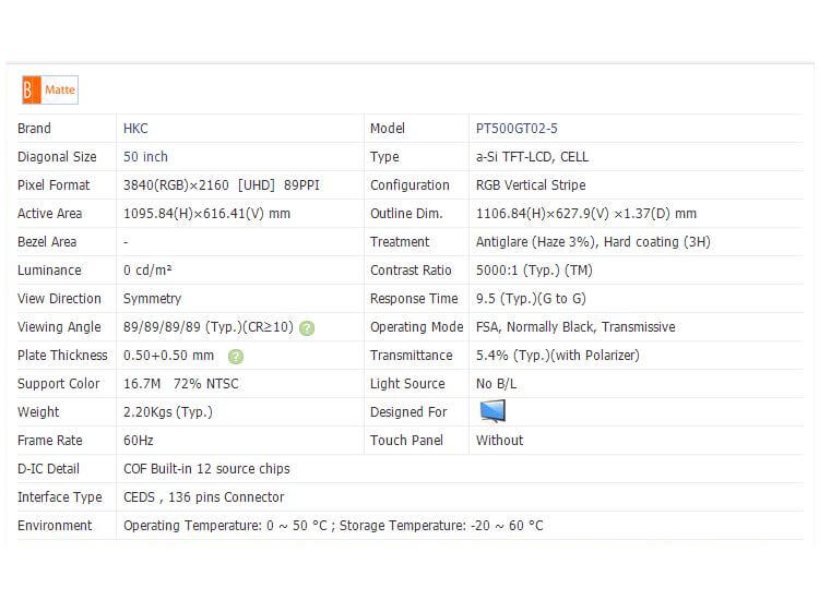 LCD TV screen HKC brand 50 inches PT500GT02-5 open cell