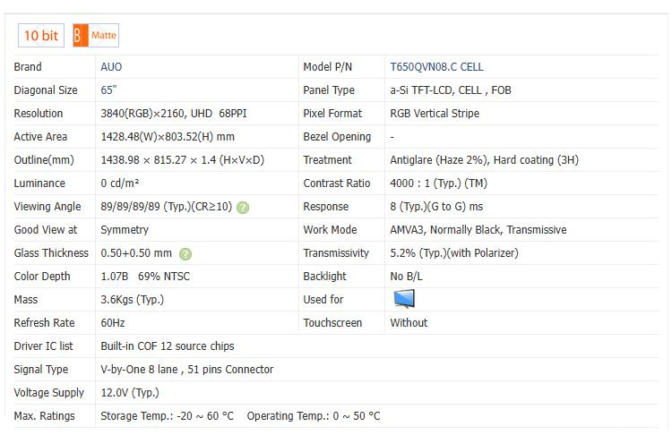 | Model name | T650QVN08.C | Display Size | 65 inches |