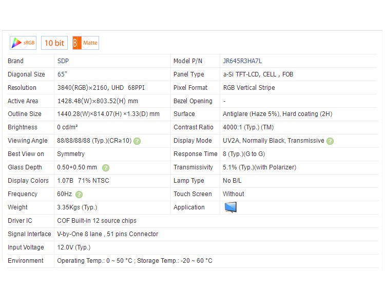 | Pixel Format | 3840(RGB)*2160 (UHD) 68PPI | D-IC Detail | COF Built-in 12 source chips |