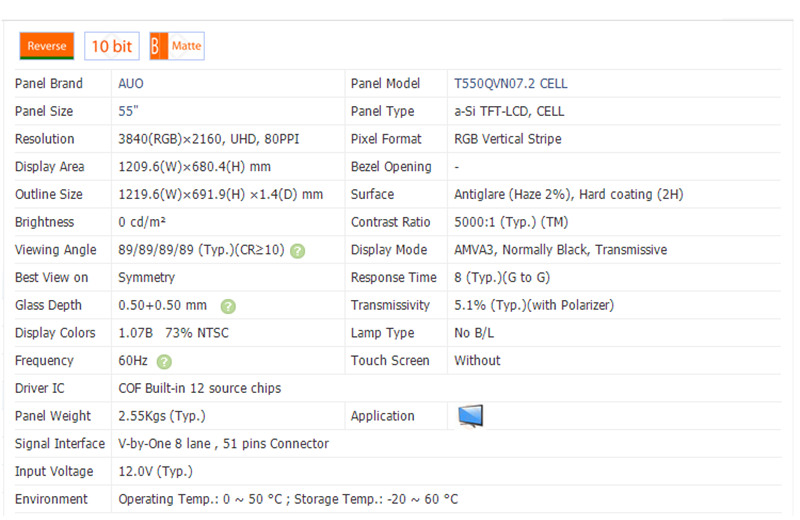 | Model name | T550QVN07.2 | Display Size | 55 inches |