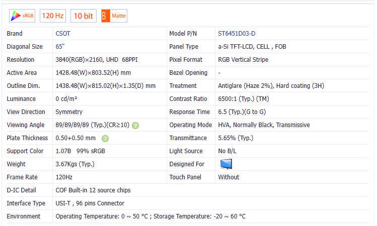 | Pixel Format | 3840(RGB)*2160 (UHD) 68PPI | D-IC Detail | COF Built-in 12 source chips |