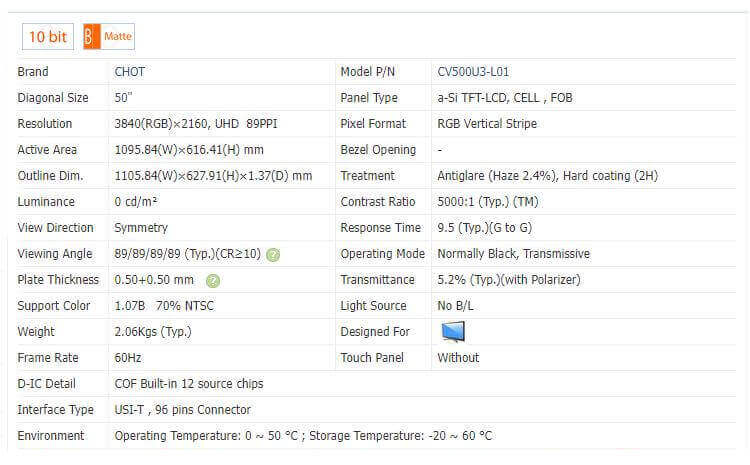 | Pixel Format | 3840(RGB)*2160 (UHD) 89PPI | D-IC Detail | COF Built-in 12 source chips |